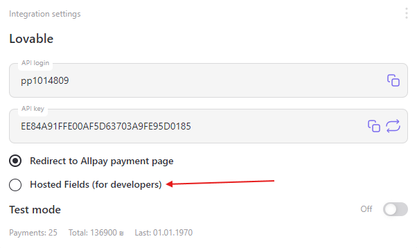 You may ask the platform where exactly the API key should be stored, but never send the API key in plain text in the chat. <span class="u-richtext-counter">3</span> Use the prompt below to integrate payments. Insert your API login and the name of the variable where the API key is stored. Adapt the prompt to your project’s logic if needed.