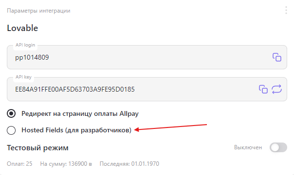 <span class="u-richtext-counter">1</span> Сменить переключатель с редиректа на Hosted Fields в настройках интеграции: